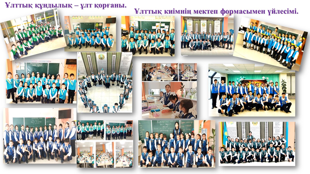 “Бес күн- бес іс -шара” атты жоспар аясында әр сәрсенбі “Ұлттық құндылықтар күні” болып белгіленді. Ұлттық киімдерді мектеп формасымен үйлестіру арқылы жастардың бойына патриоттық тәрбие беру көзделген.