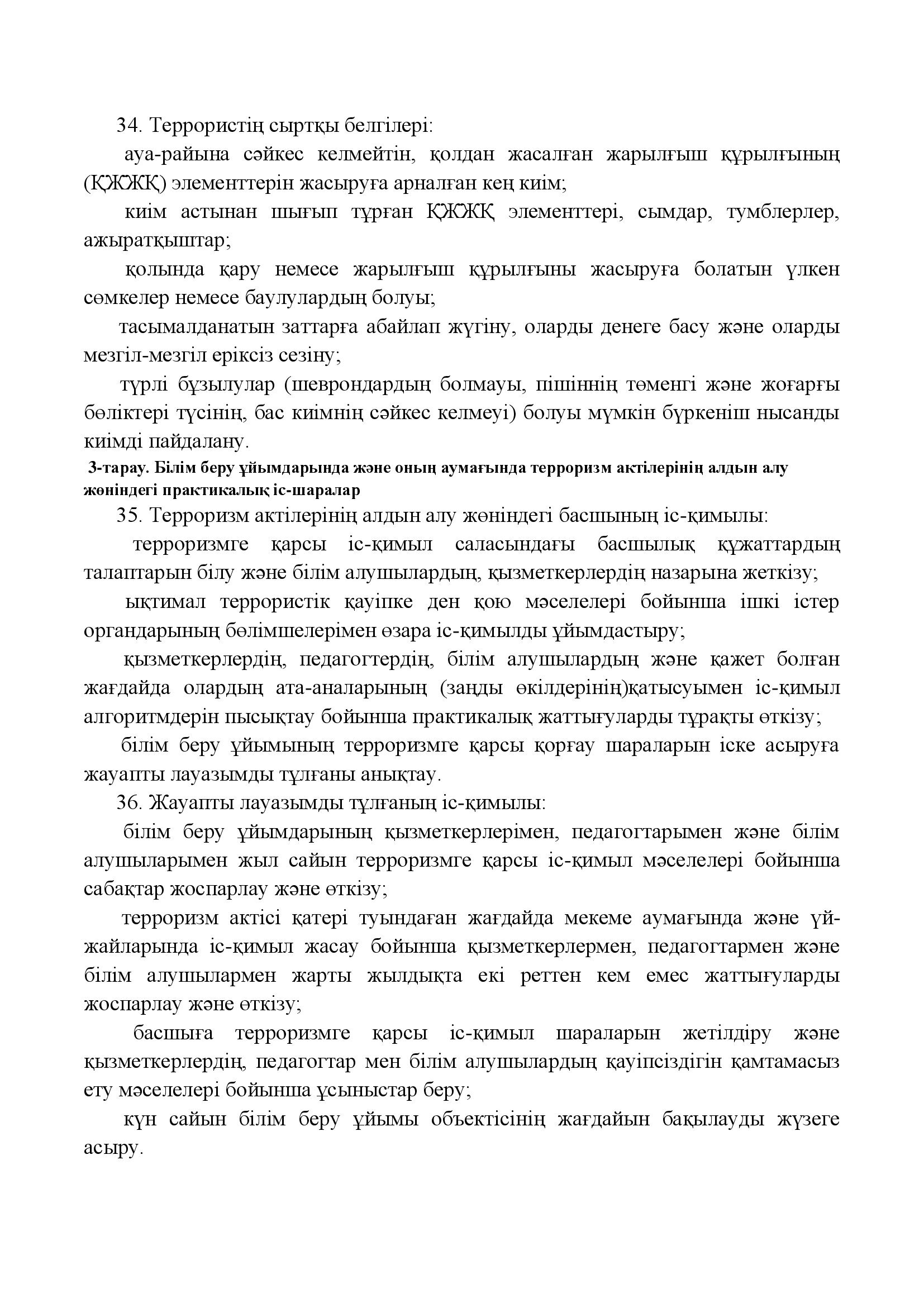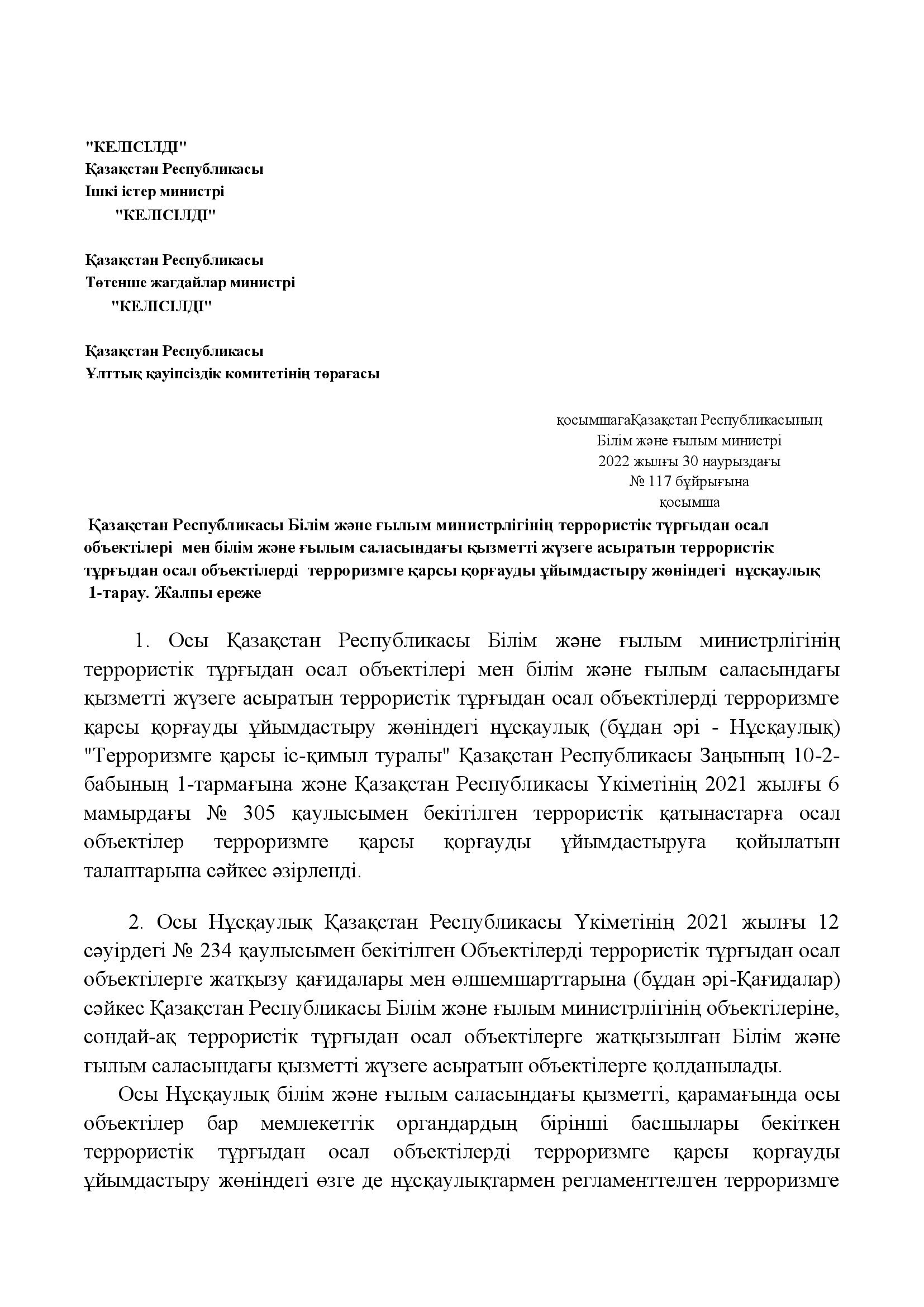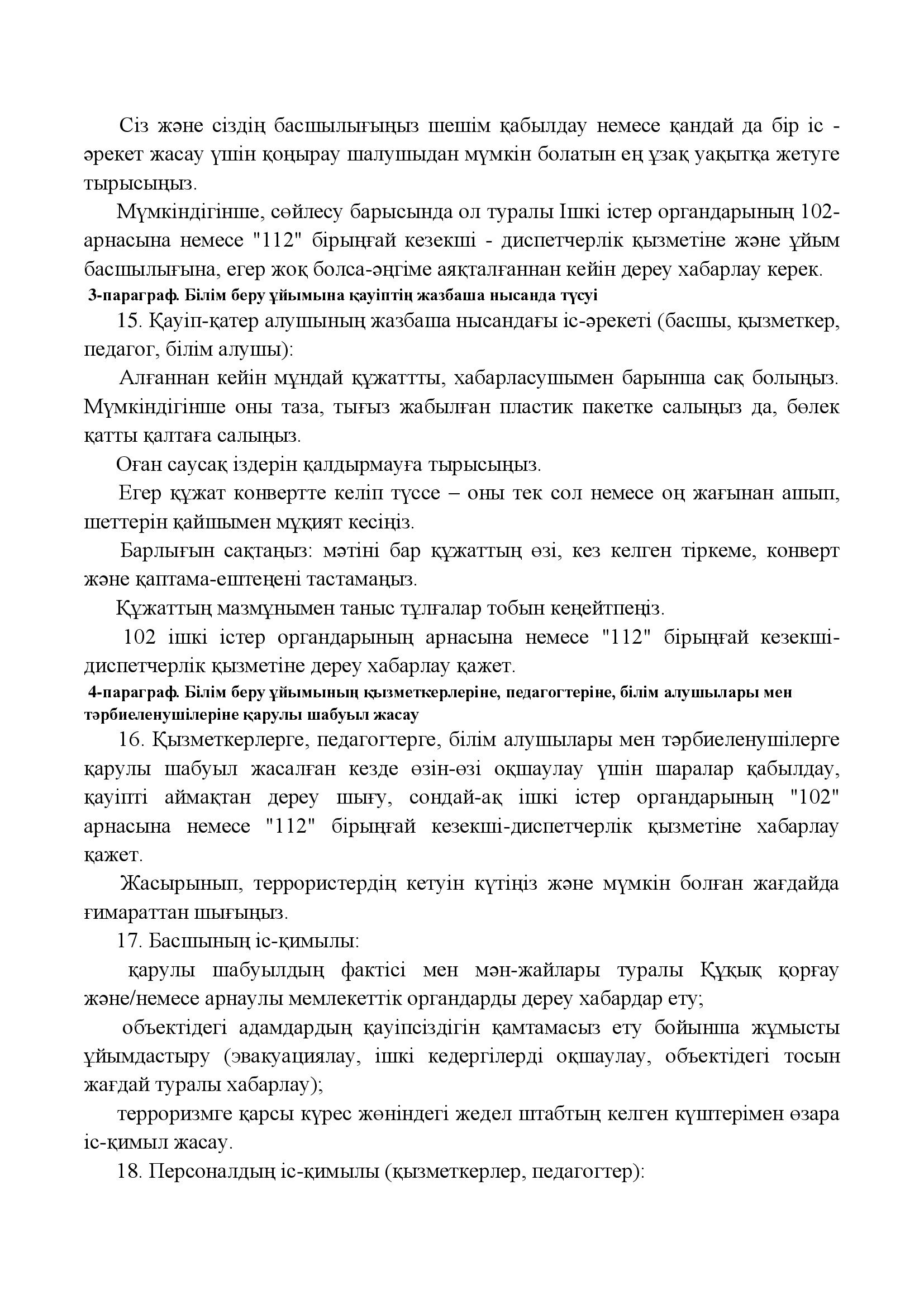 04 наурыз 2024 0 1 2 3 4 5 2022 жылғы 30 наурыздағы № 117 бұйрығы. "Терроризмге қарсы іс-қимыл туралы" -117-bjry_-antiterror_30-03-2022_kaz.pdf [534,66 Kb] (cкачиваний: 0) Посмотреть онлайн файл: -117-bjry_-antiterror_30-03-2022_kaz.pdf