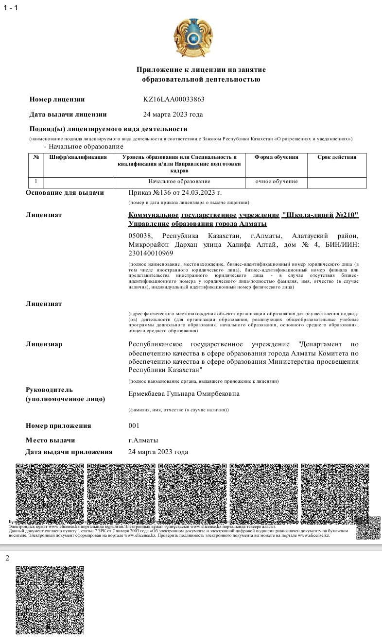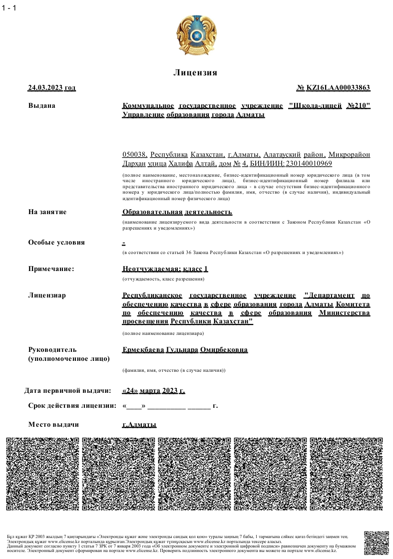 - Білім мекемесінің толық атауы «№210 мектеп-лицей»КММ