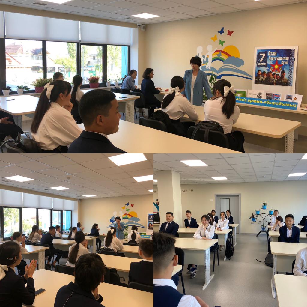 Қазақстан Республикасының Қарулы күштерінің құрылуы,оның Отанымыздың бейбітшілігін сақтаудағы маңызы жайлы,әскери өнердің өзіндік ерекшелігі туралы,егемендігімізді күзетуде олардың маңызы жөнінде терең мағлұмат бере отырып ,оқушыларды туған елін, Отанын,тілі мен мәдениетін құрметтеп,тарихты терең бағалау және патриоттық сезімге тәрбиелей келе ,оқушыларға кітап пен кітапхана маңызы жөнінде пікір алмасу мақсатында