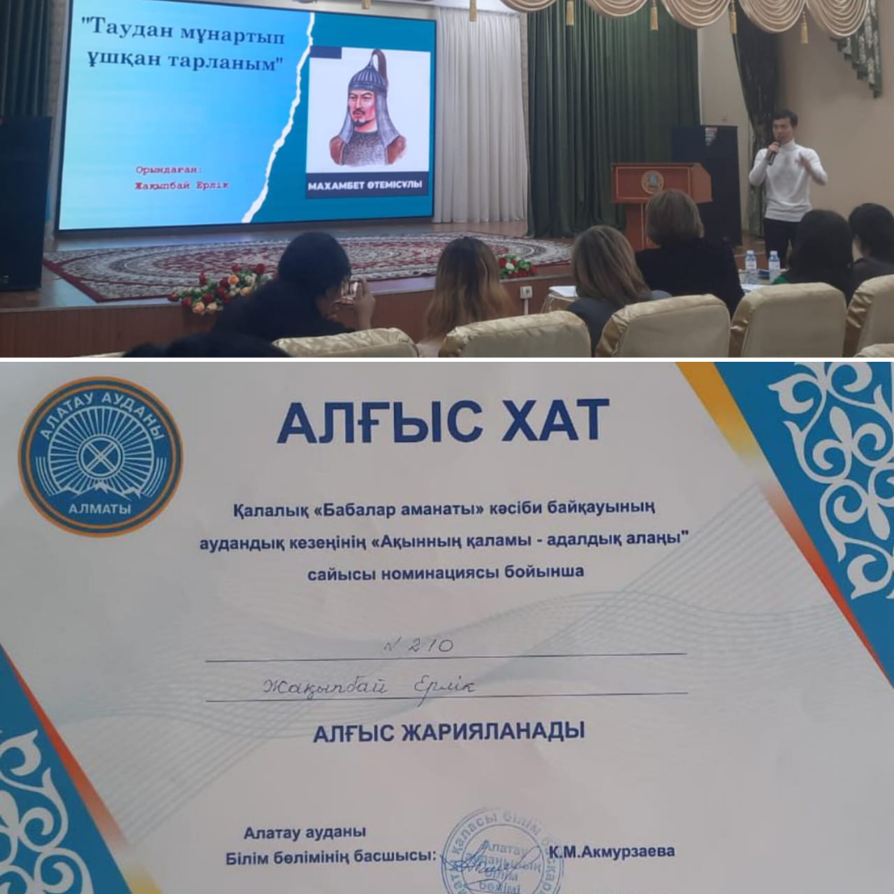 Ұстаз — келер күннің ұстасы. Бабалар аманатын арқалап, топтан озып, жеңіс туын желбірету де тек білікті ұстаздың қолынан келеді.№ 210 мектеп-лицейдің қазақ тілі мен әдебиеті пәні мұғалімі Дәурен Бүбіш аудан көлемінде ұйымдастырылған «Бабалар аманаты» байқауының «Шешендік өнер» сайысында жүлделі *І орын иегері* атанып, қалалық кезеңге жолдама алды. *Бүбіш Дәуренқызы*, жеңісіңіз құтты болсын! Сондай-ақ қазақ тілі мен әдебиеті пәні мұғалімі *Жақыпбай Ерлік* аудан көлемінде ұйымдастырылған «Бабалар аманаты» байқауының «Ақынның қаламы – адалдық алаңы» номинациясында көзге түскен жас маман. Алда алар асуыңыз биік болсын! Қаладан да қанжығаңыз майлансын! Сәттілік!