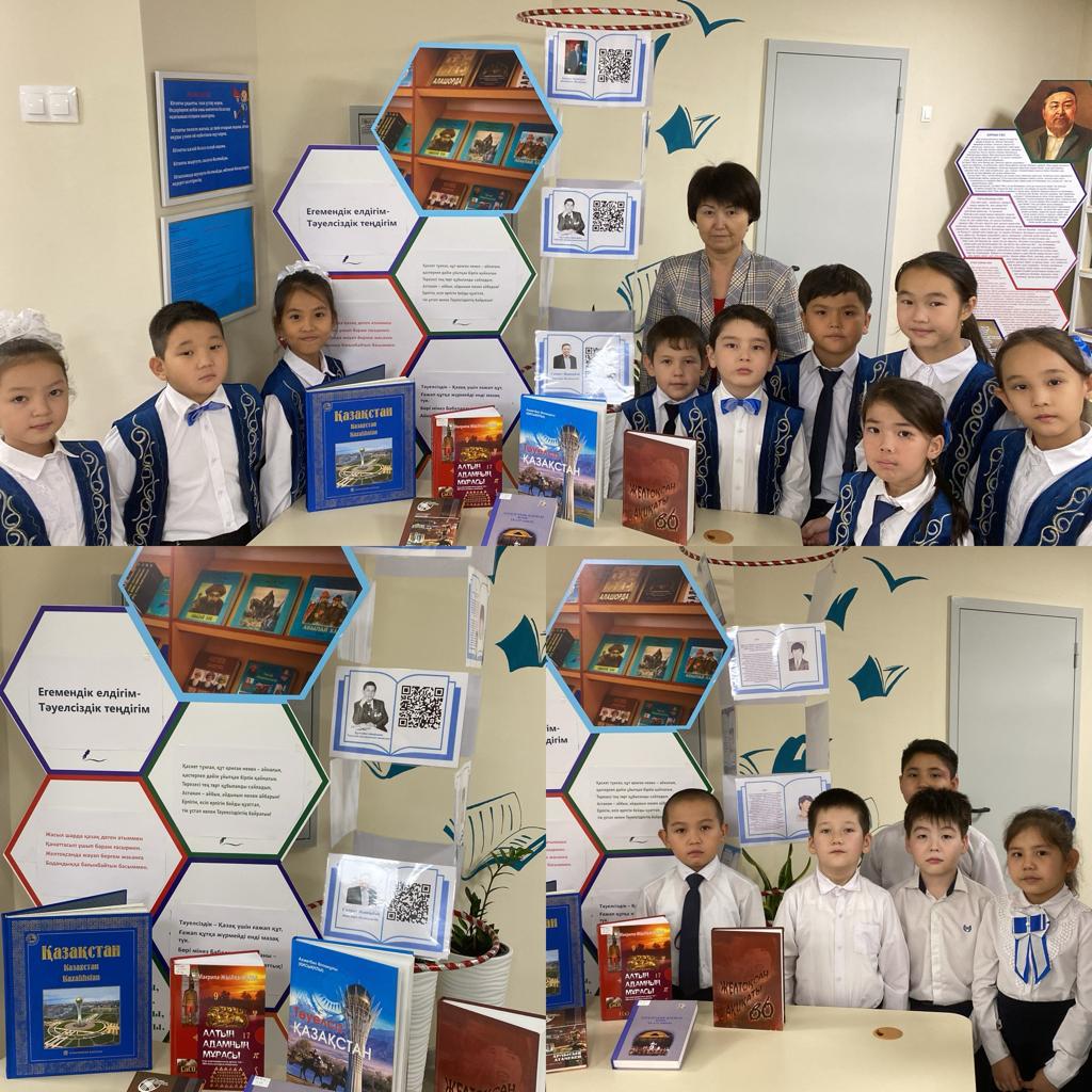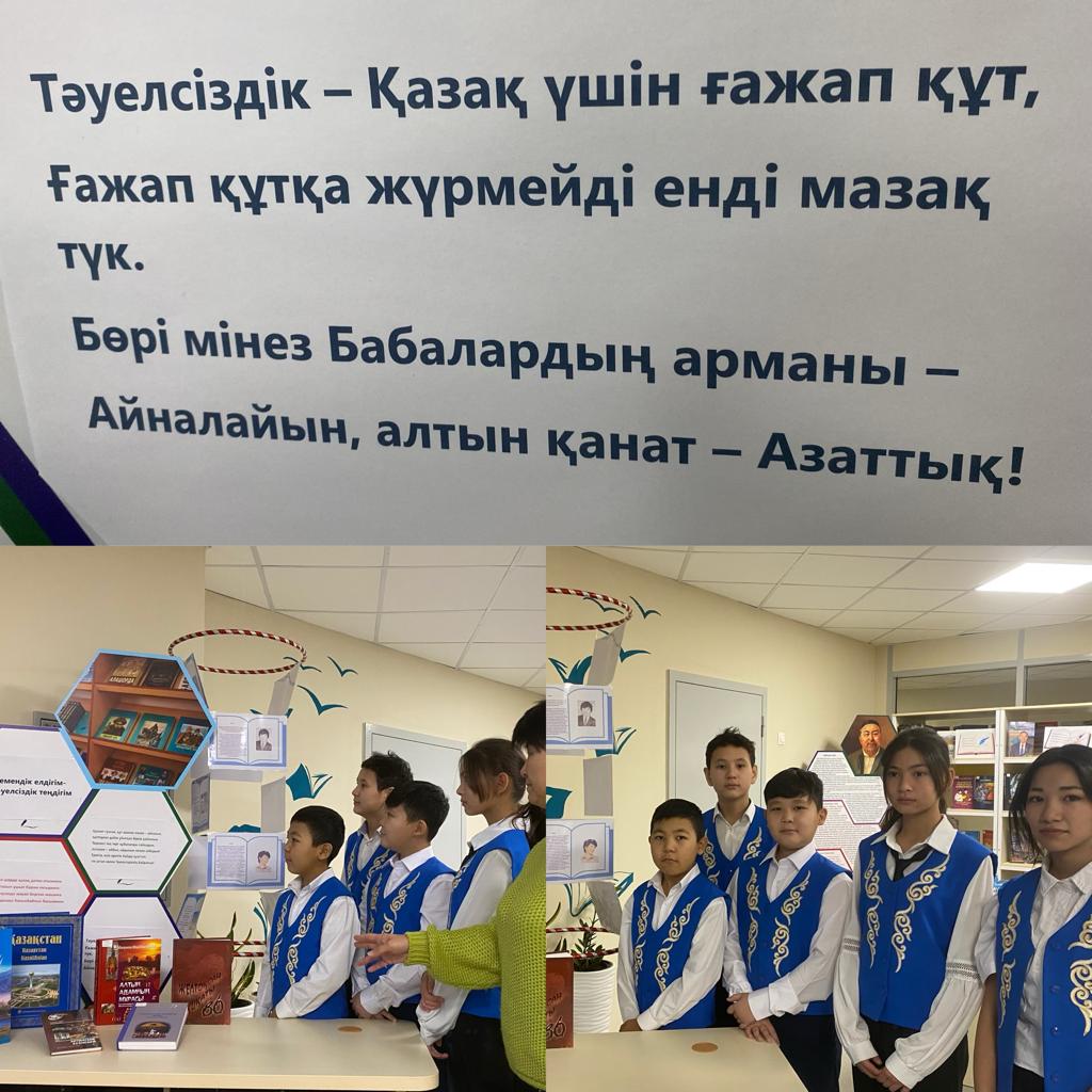 Тәуелсіздік – Қазақ үшін ғажап құт, Ғажап құтқа жүрмейді енді мазақ түк. Бөрі мінез Бабалардың арманы – Айналайын, алтын қанат – Азаттық! тақырыбында оқушыларға қазақ халқының егемендікке жету жолындағы тарихи кезеңдер туралы мағлұмат бере отырып, Отанға деген азаматтық, патриоттық сезімді қалыптастыру, кітап оқуға қызығушылықтарын ояту мақсатында кітап көрмесі ұйымдастырылып, ақын жазушылардың осы тақырыпқа байланысты еңбектері ұсынылды.