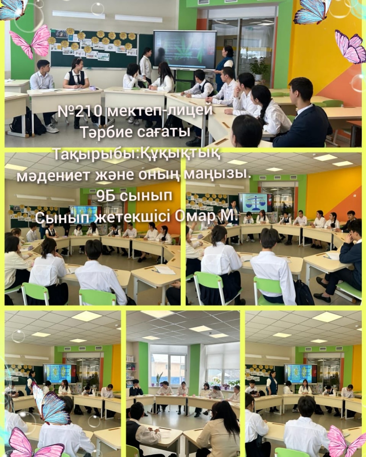 Мақсыты:Оқушыларға заң білімі саласынан мағлұмат беру; өз құқықтарын жете білуге, өз беттерімен салыстыра білуге, өмірде қолдана білуге үйрету; құқықтық білімдерін толықтыру. Адамгершілік, адалдық, әділдік пен мейірімділікке баулу арқылы саяси саналығы мен таным белсенділігін арттыру. Еліміздің Ата заңын және басқа заңдарды құрметтеуге, сыйлауға тәрбиелеу; патриоттық тәрбие беру. Тақырыбы: Құқықтық мәдениет және оның маңызы.