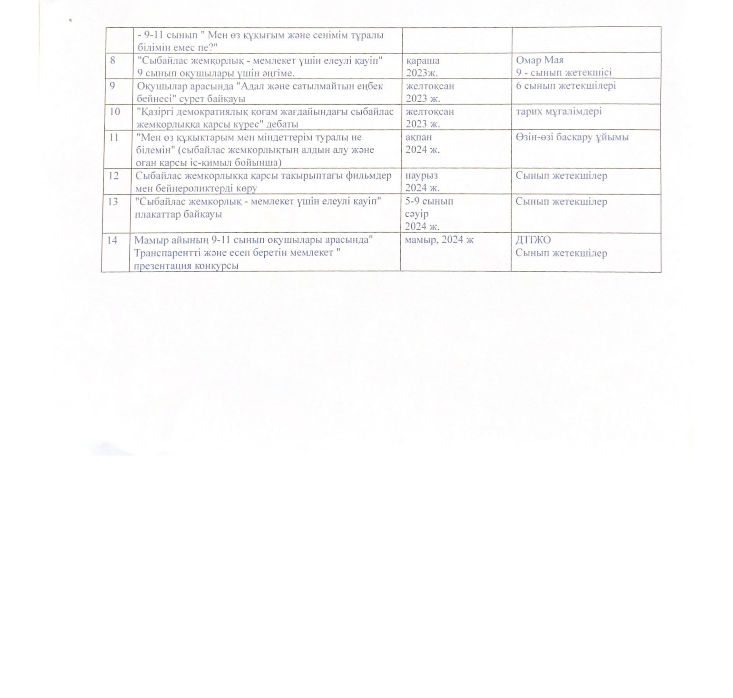 01 қыркүйек 2023 0 1 2 3 4 5 Сыбайлас жемқорлыққа қарсы мәдениетті мектеп ортасында қалыптастыру жөніндегі жоспар