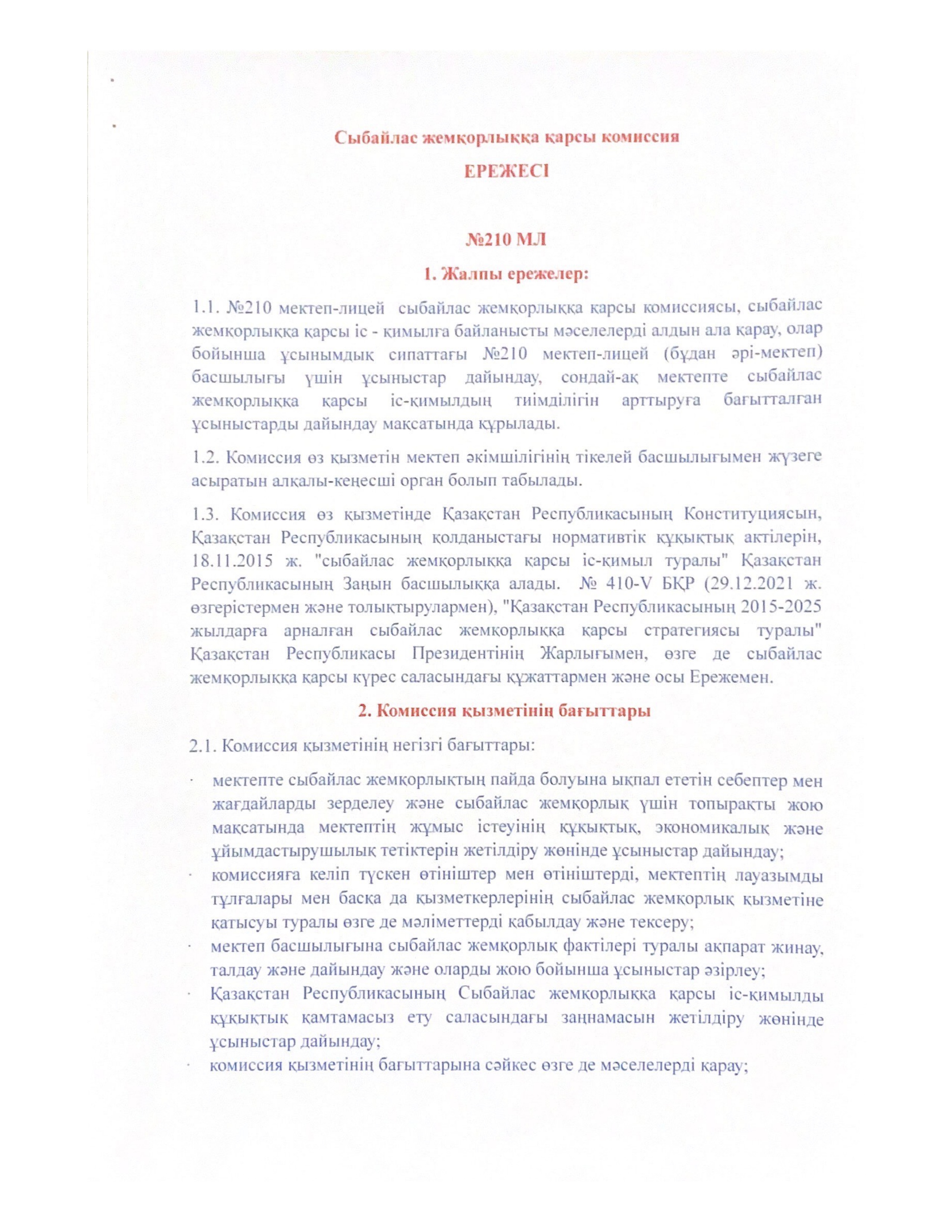 Сыбайлас жемқорлыққа қарсы комиссия » №210 мектеп-лицей