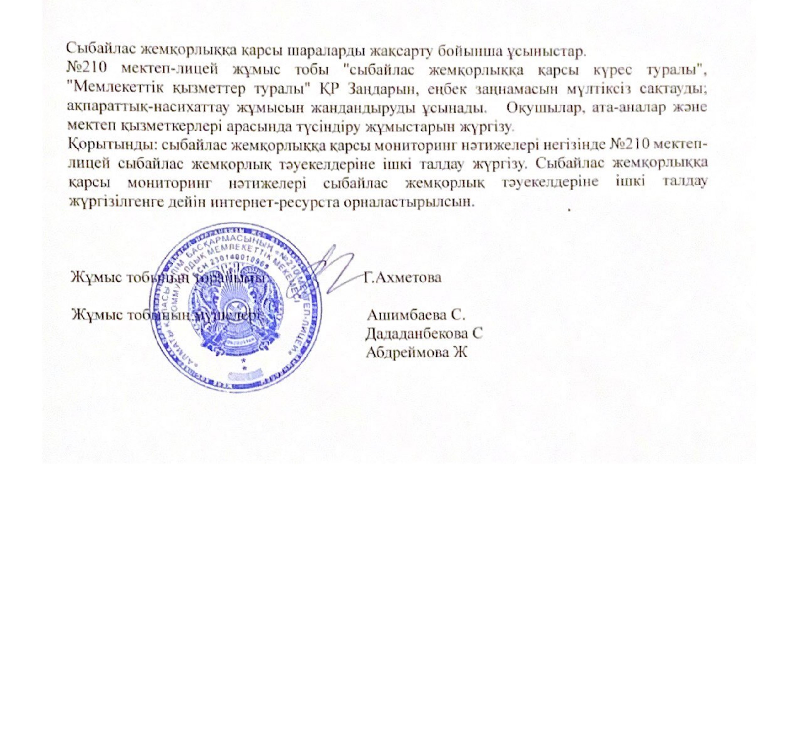 Сыбайлас жемқорлыққа қарсы мониторингтің нәтижесі » №210 мектеп-лицей