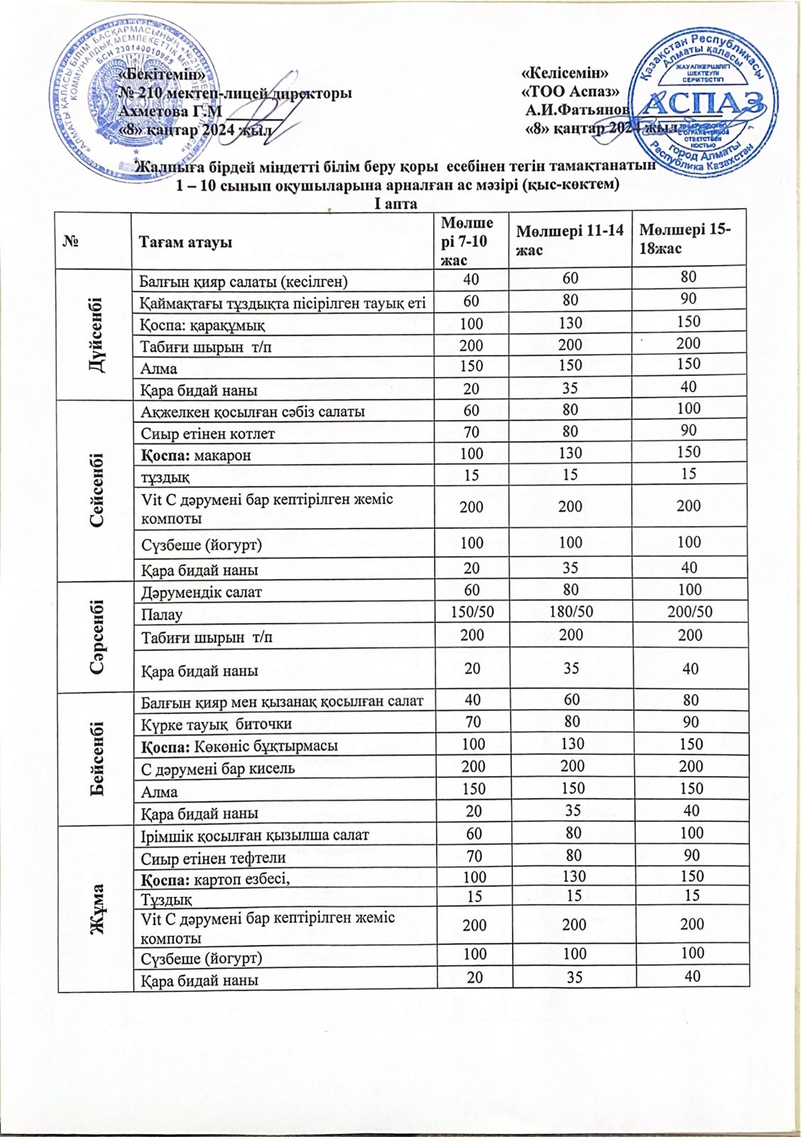 1-АПТА АС МӘЗІРІ » №210 мектеп-лицей