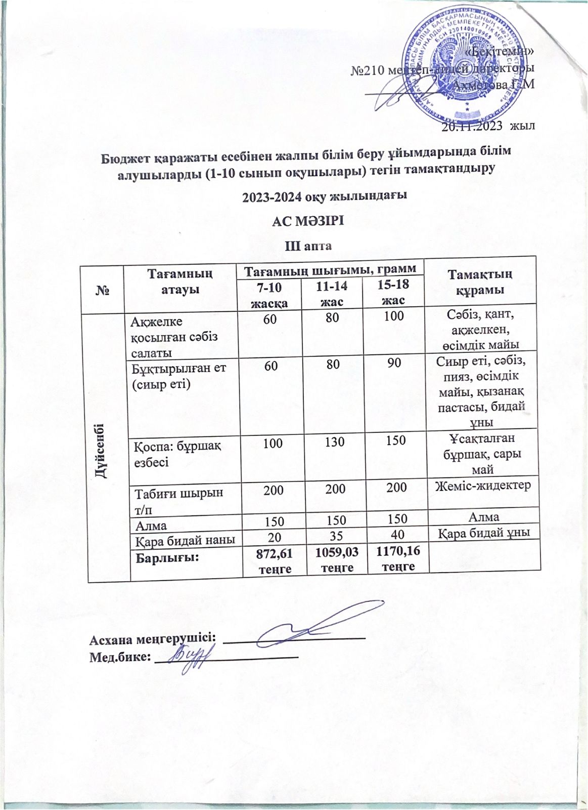 Ас мәзірі 20.11.2023 » №210 мектеп-лицей
