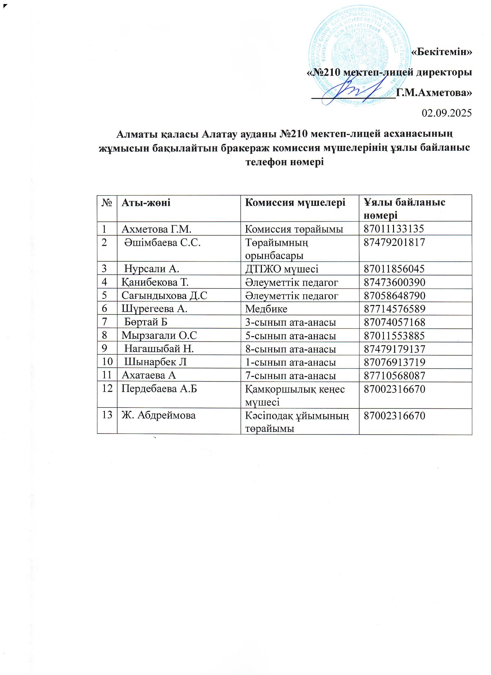 бракеражды комиссия мүшелерін байланыс номрлері » №210 мектеп-лицей